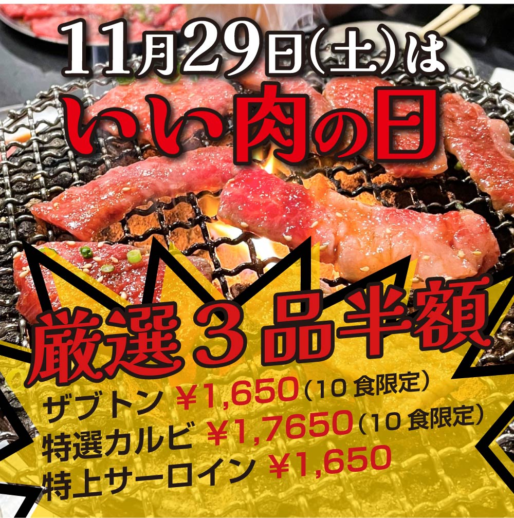 11月29日(土)は「いい肉の日」として炙りや牛ぞうが厳選したザブトン・特選カルビ・特上サーロインの3品をなんと半額でご提供!!
